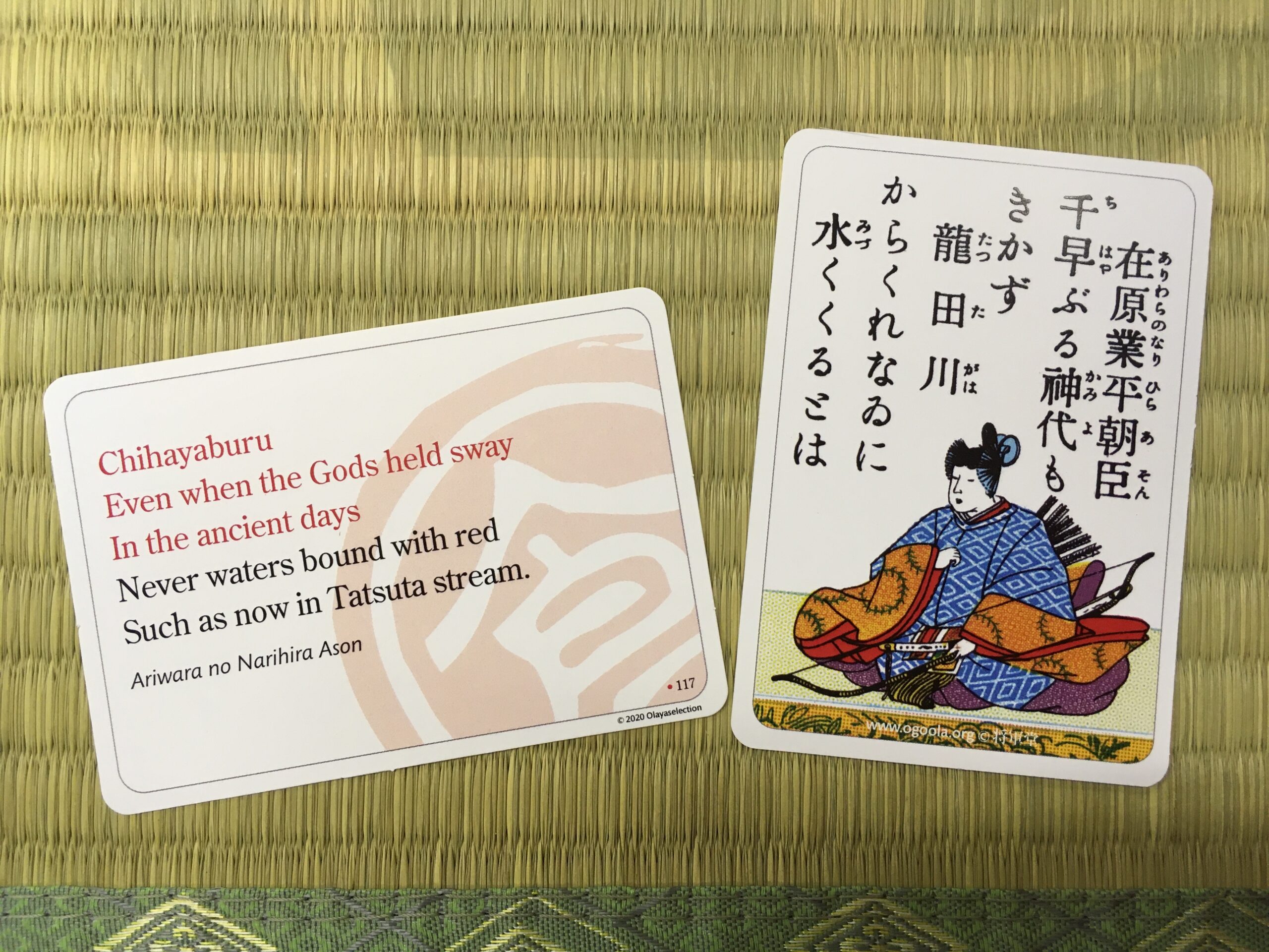 Click here below and listen to our new recording of the Hyakuninisshu English Translated Karuta, using the original Makurakotoba, Chihayaburu. You can download it for free under Media/Downloads on this website.